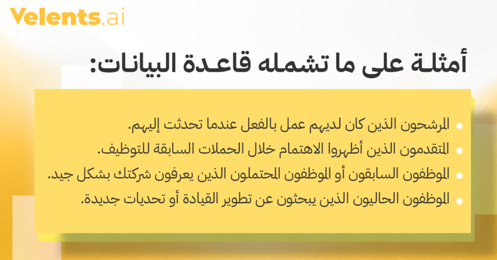 قاعدة  المواهب الصحية تمنحك وصولًا سريعًا إلى الأشخاص الذين تعرف بالفعل أنهم مناسبين للأدوار التي تقوم بتوظيفها. وفشل إدارة قاعدة مواهبك بكفاءة يزيد من وقت التوظيف الخاص بك بشكل محتمل، ومخاطرة بتوظيف موظفين غير أكفاء.