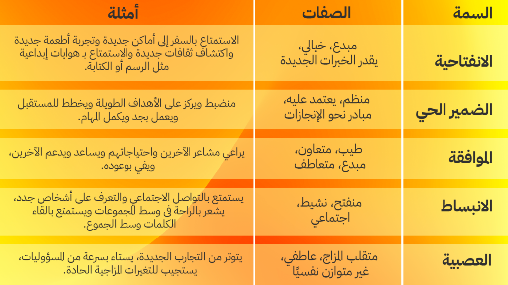 فى البداية دعنا نعرف أكثر عن نموذج المعايير الـ5 الكبير والذي يعرف بأنه نظرية تصف السمات التي تعمل بمثابة اللبنات الأساسية للشخصية، السمات الشخصية الخمس الكبرى هي مجموعة مقترحة لسمات الشخصية بناءً على نظرية السمات النفسية ، حيث يتم تحديد خمس سمات شخصية كبيرة في الانفتاح والضمير والانبساط والقبول والعصابية.