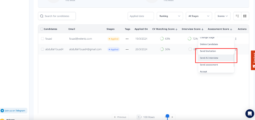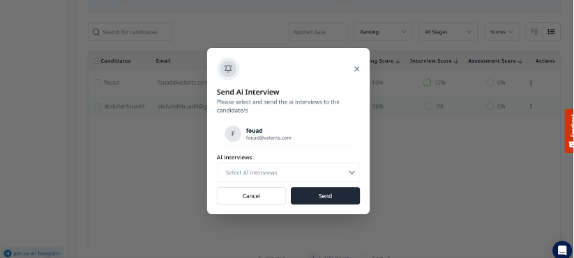 - يمكنك الآن إرسال المقابلات أو التقييمات التي تستخدم الذكاء الاصطناعي مباشرة إلى المرشحين دون الحاجة إلى إضافتهم في الخطوة الثانية من عملية إنشاء الوظيفة أو إنشاء دعوة للعمل.
